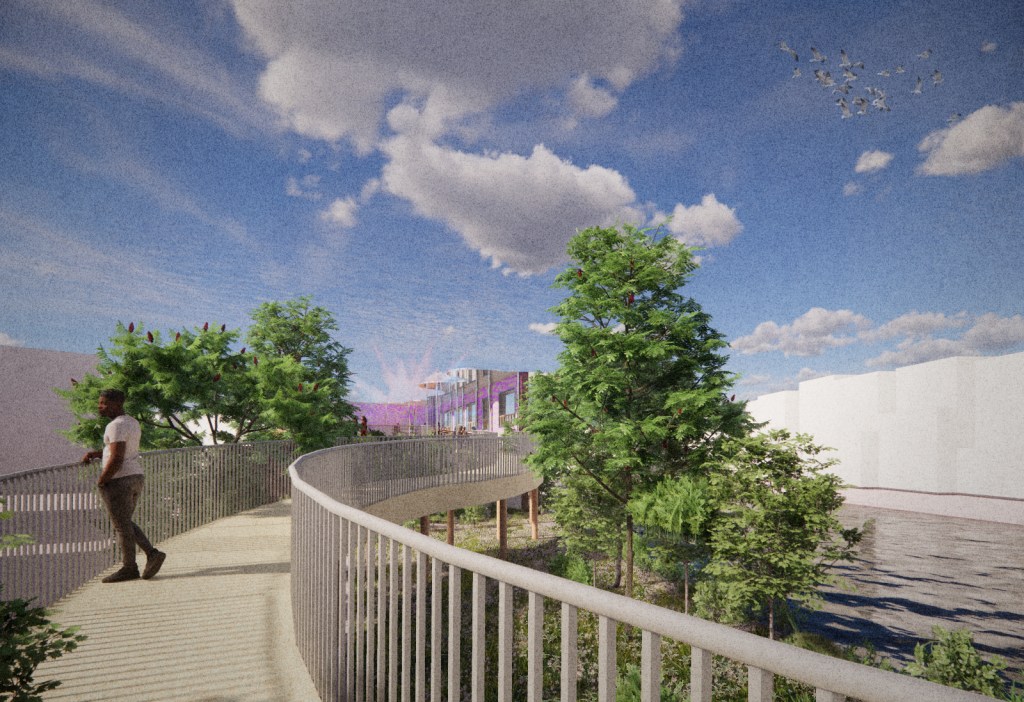 You can take in the multiple views of East London while you walk through the foliage in the sun. The open glass floor ensures that anyone hiring the space below can access natural sunlight. With this design I was able to make it accessible, with the ramped walkway. I also used sustainable materials and retained most of the old building. I enjoyed creating these renders as I got more familiar with Sketchup, Enscape and Affinity software, and I liked the program of creating a community space to bring people together.